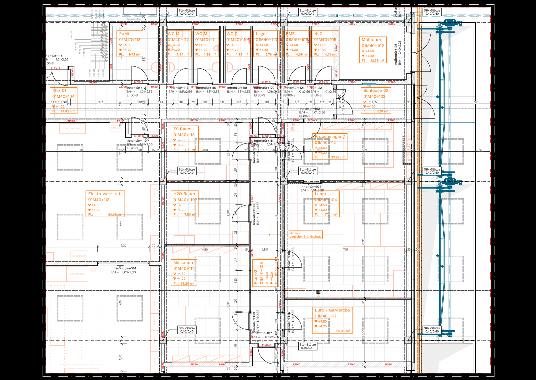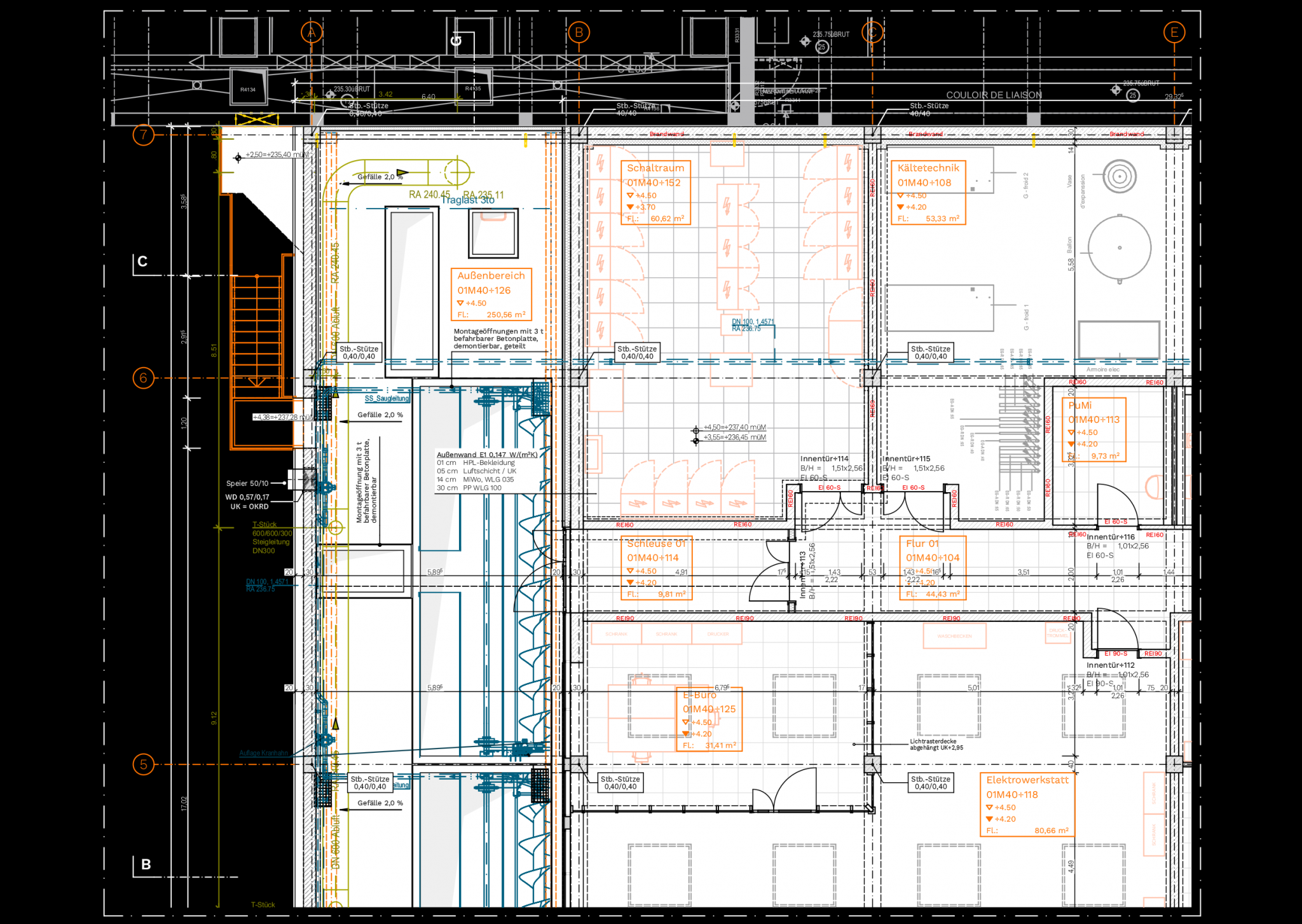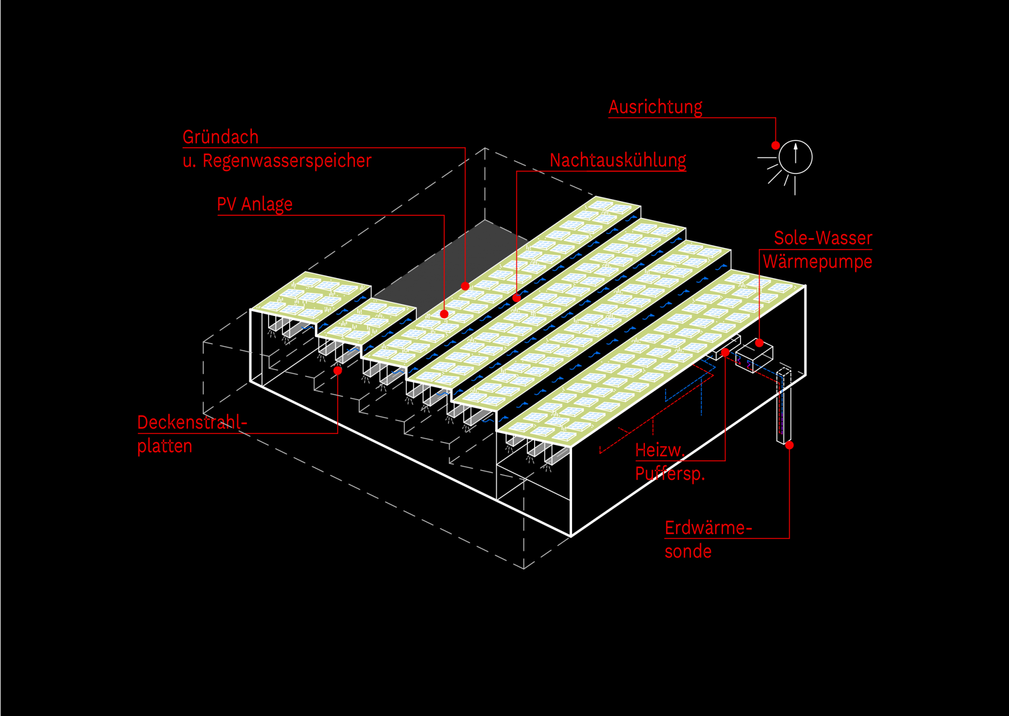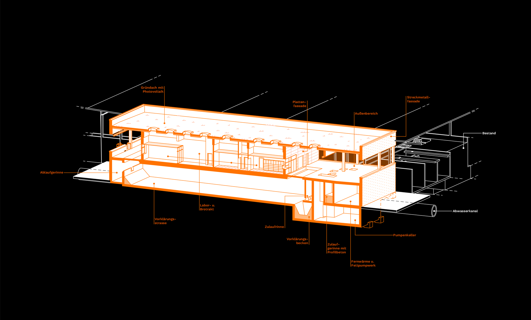 Gemeinsam mit unserem Partner Hydro haben wir aus einem Gebäude, Typologie Vorklärung, mit nur einem Nutzungsschwerpunkt ein multifunktionales Hybridgebäude entwickelt, um den Nachhaltigkeitskriterien zu genügen. Dies wurde beispielsweise durch die Optimierung der Grundrisse (Wege, Dichte, Flächenverbrauch) ermöglicht und ist klar an der BGF ablesbar, welche um 16% (6230qm zu 5210qm) verringert wurde. Ziel war es sowohl Anlagentechnik als auch Architektur zu optimieren und in Einklang zu bringen.
